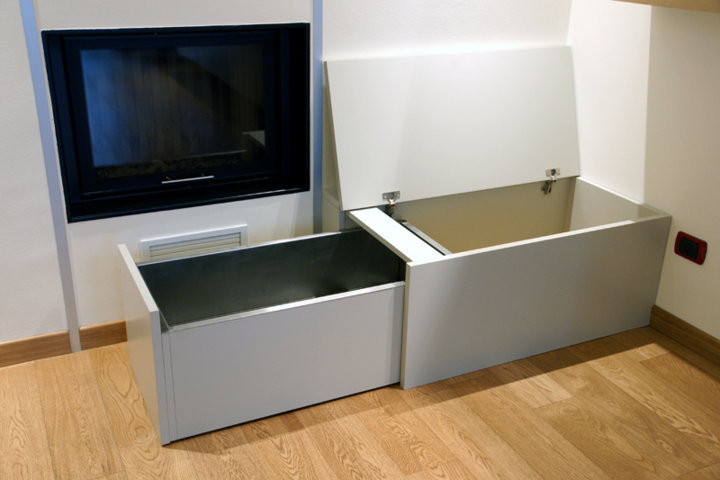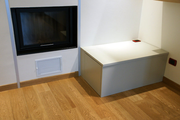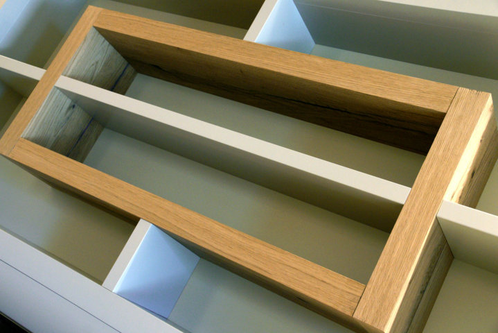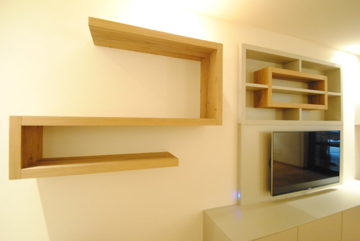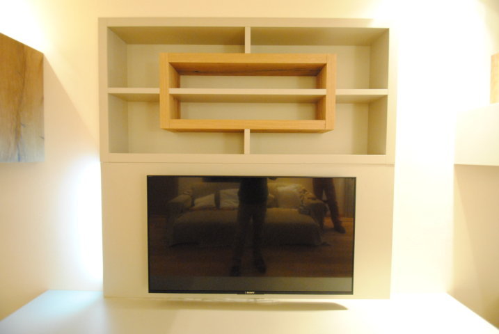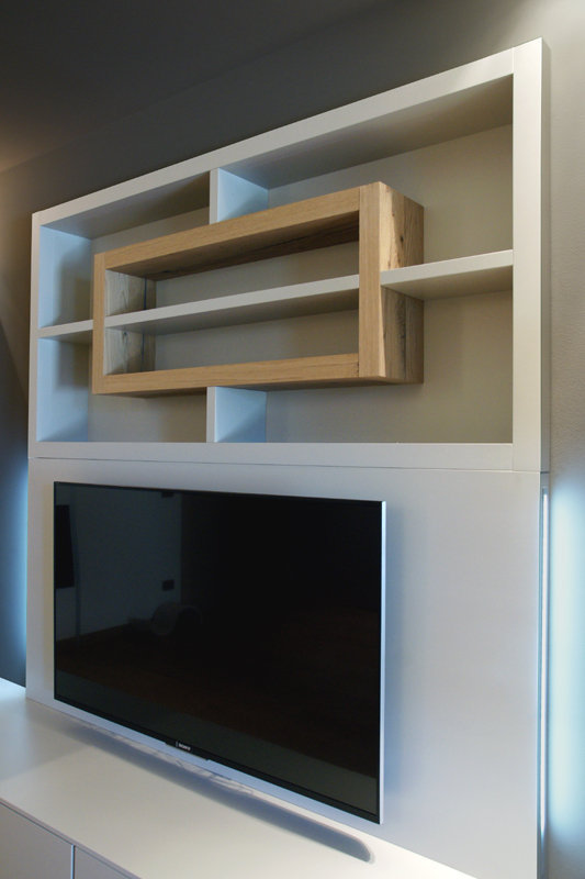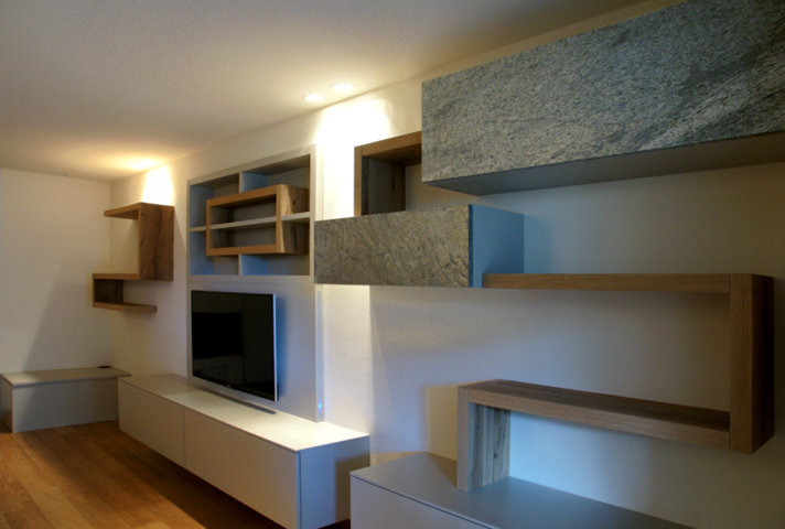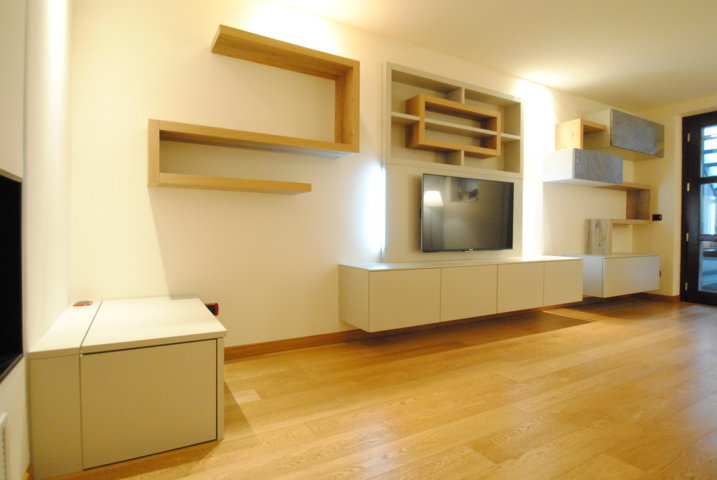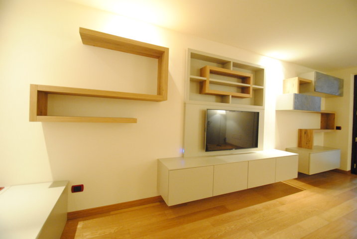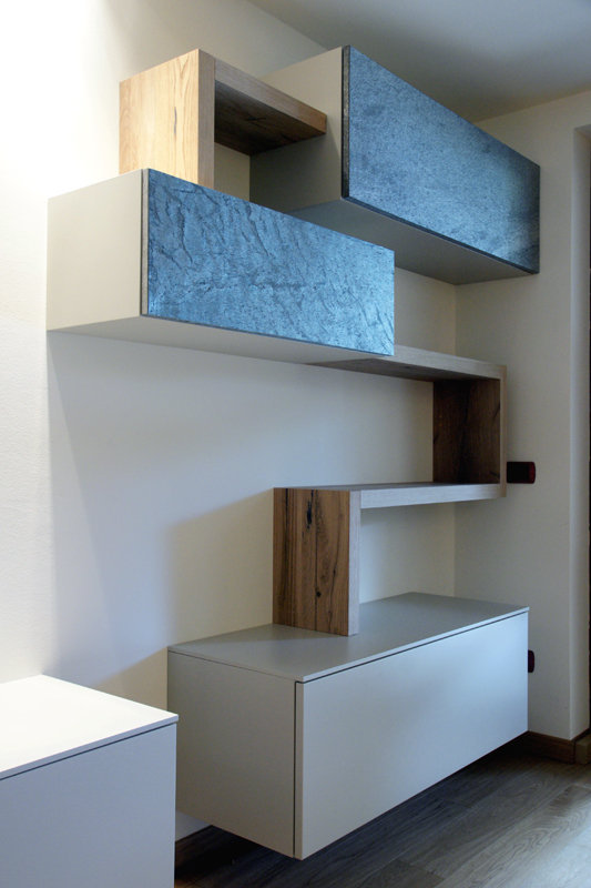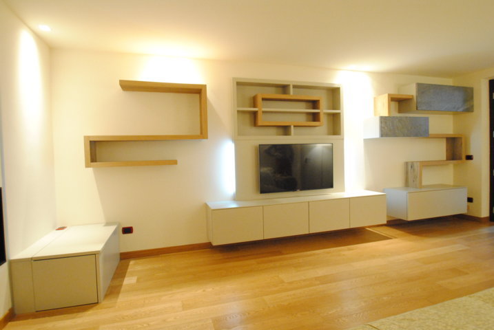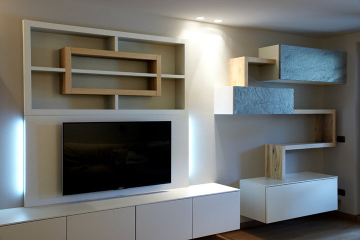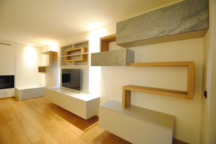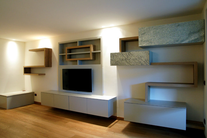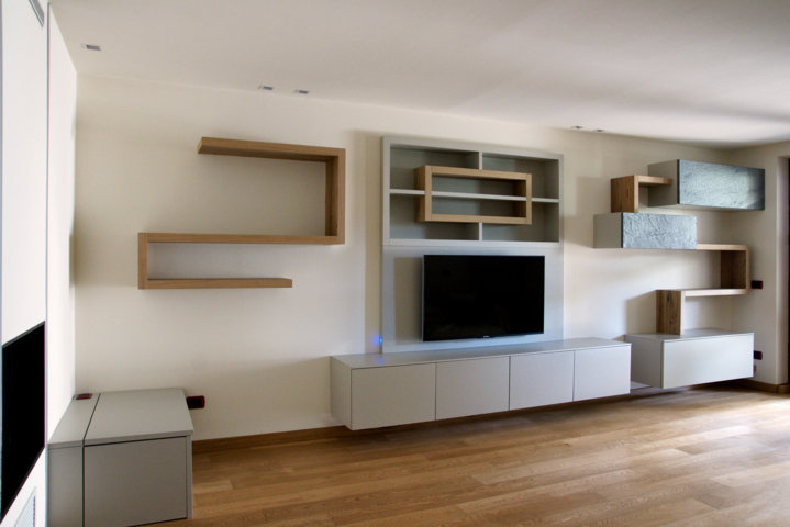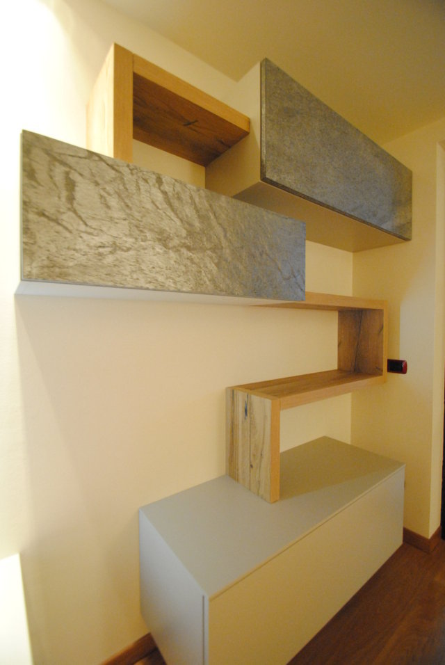 I fianchi portanti di forte spessore e i piani orizzontali creano vani a giorno dove il gioco delle ante “debordanti”, pulite e prive di maniglie, si compongono in una nuova grafica a parete.